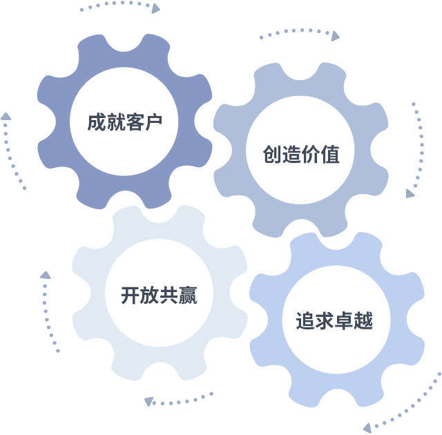 成就客户是一切决策的出发点,,,,创造价值是衡量所有工作的标准,,,,追求卓越是我们做事做人的态度,,,开放共赢是我们的格局也是最终的结果。。价值观的齿轮环环相扣,,,推动着组织里的每个人不断向前。。。